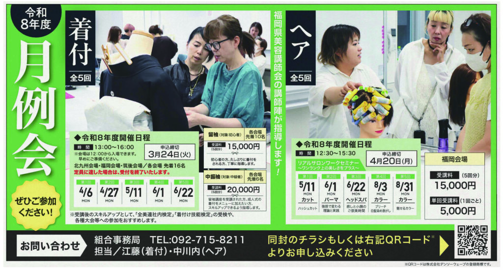 令和8年度月例会を4月より開催いたします。 福岡県美容講師会の講師陣が丁寧に指導いたしますので、ぜひご参加ください。